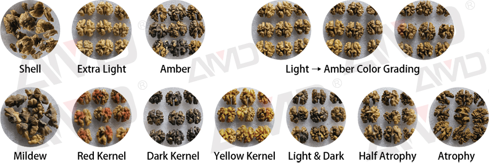 Skutecznie usuwa orzechy uszkodzone, takie jak pomarszczone, czerwone, niebieskie, czarne, spleśniałe, z plamami wodnymi, z czarnymi plamami, z pozostałościami przegród, jądra w skorupie, fragmenty skorupy lub przylegające łupiny.